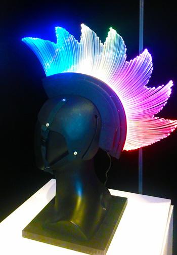 當(dāng)然,使用3D打印這種要求極高的頭盔同樣需要復(fù)雜的設(shè)計和操作,特別是需要保證其耐用性,確保在整個巡演過程中不出任何差錯。在這個頭盔中,設(shè)計師使用了兩種打印技術(shù),F(xiàn)DM和PolyJet。在頭盔類似雞冠的部分使用了FDM打印技術(shù),材質(zhì)為ABS-M30FDM熱塑性材料,F(xiàn)DM技術(shù)可以將所有部件固定在一起;里面部分則通過PolyJet技術(shù)打印,使用了Stratasys公司提供的的VeroGray材料。PolyJet打印技術(shù)最大限度地提高了頭盔上LED照明(如圖中頭盔頂部發(fā)光的有機(jī)玻璃)的視覺效果,為巡演制造出更好的光影效果。