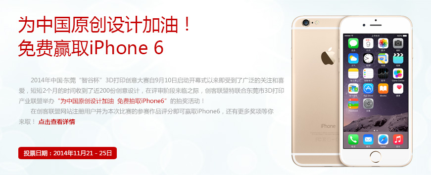 2014年中國?東莞“智谷杯”3D打印創(chuàng)意大賽自9月10日啟動(dòng)開幕式以來就受到了廣泛的關(guān)注和喜愛,短短2個(gè)月的時(shí)間收到了近200份創(chuàng)意設(shè)計(jì),在評審階段來臨之際,創(chuàng)客聯(lián)盟特聯(lián)合東莞市3D打印產(chǎn)業(yè)聯(lián)盟舉辦“為中國原創(chuàng)設(shè)計(jì)加油 免費(fèi)抽取iPhone6”的抽獎(jiǎng)活動(dòng)!