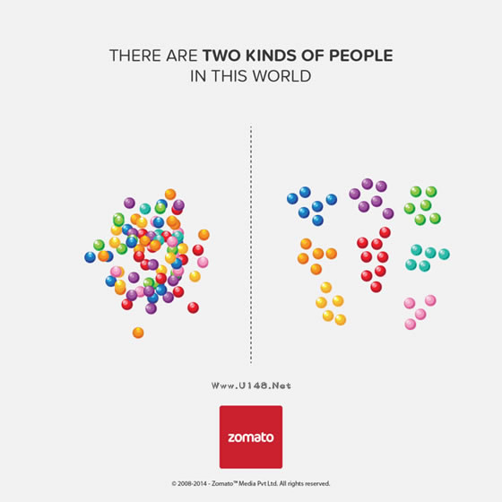 小編平時說世上的人千差萬別,針對不同的事物又有不同的喜好。但是Zomato公司分析了人們在食物、就餐行為上的偏好,卻發(fā)現(xiàn)了一個令人驚訝的事實(shí):世界上只有兩種人!隨后他們把這一結(jié)果用一張張插畫海報對比呈現(xiàn)了出來。小伙伴們快來對號入座吧。